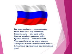 С 22 августа 1994 года прямоугольный стяг, состоящий из трех равновеликих горизонтальных полос, — белой (символ свободы), синей (символ Богородицы) и красной (символ русской державы) — начали считать государственным флагом. Хотя сегодня неофициальная трактовка цветов триколора чуть расширилась: белый — мир, чистота, непорочность; синий — вера и верность; красный — энергия, сила, кровь, пролитая за Отечество.