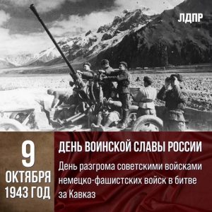 День воинской славы России – День разгрома советскими войсками немецко-фашистских войск в битве за Кавказ (1943 год), отмечаемый 9 октября, установлен летом 2020 года.
