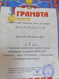 02 июля состоялась Спартакиада между пришкольными лагерями Фокино. Команда «Комета» Дома детского творчества из нашего лагеря «Радуга» приняла участие в спортивных состязаниях и в сдаче норм ГТО. Пройдя спортивную эстафету, состоящую из 5 этапов, ребята заслуженно выиграли первое место и были награждены грамотой. В соревнованиях «Командные прыжки в длину с места» также заняли 1 место. В соревнованиях «Комбинированная эстафета» также заняли 1 место. У нас самые спортивные дети, физически развитые, они занимаются хорошо и на уроках физической культуры в своих школах и дополнительно посещают спортивные секции нашего города. Наши воспитатели, а именно Ирина Анатольевна Федотова и Анастасия Александровна Шинкарева приложили усилия к подготовке ребят к соревнованиям. И мы благодарим их также, как и всех педагогов, занимающихся физической подготовкой ребят нашего города. Это так важно, когда дети растут физически развитыми и здоровыми!